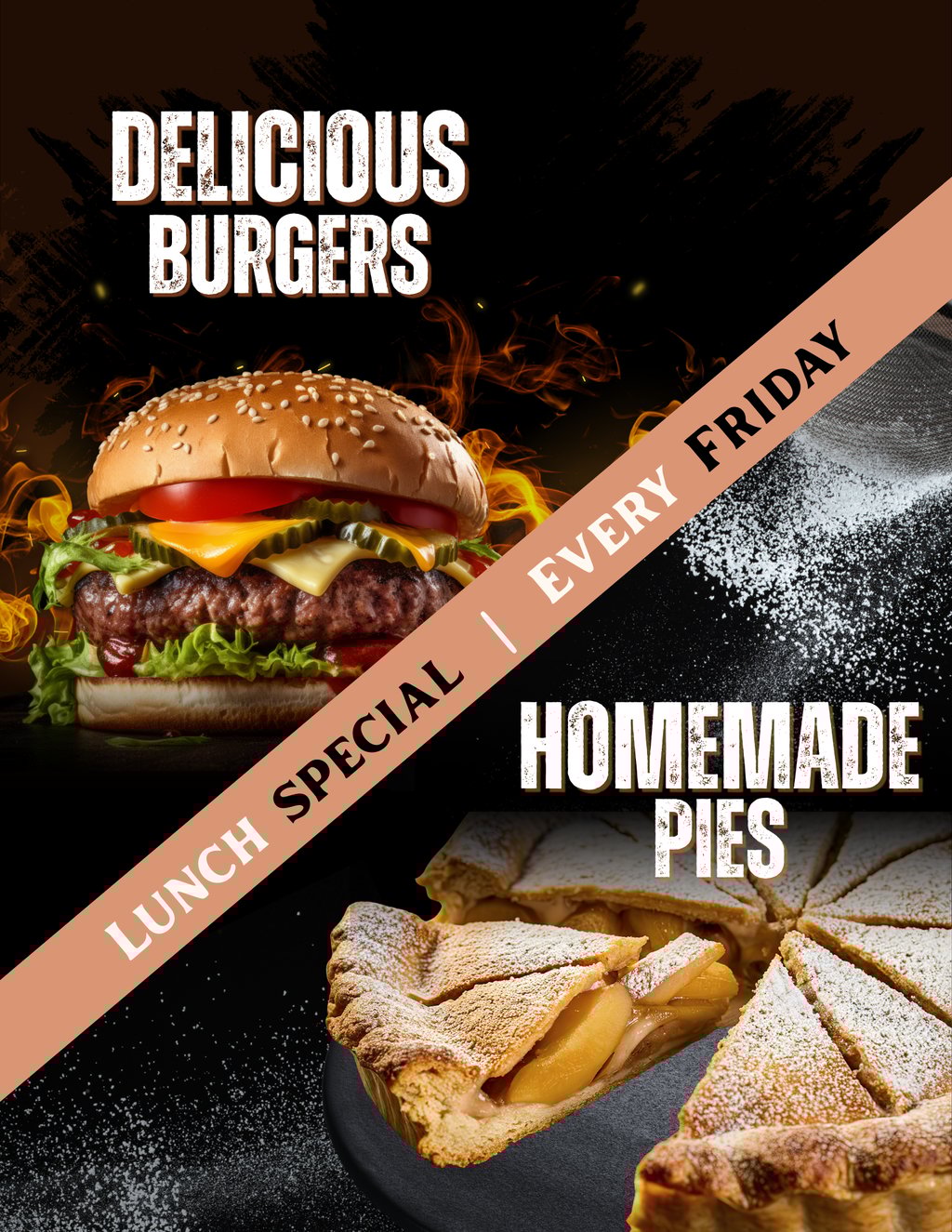 Join us for lunch from 11am–1pm and enjoy our juicy burgers. Every meal comes with crispy chips and a refreshing drink from the Coke fridge. And to finish on a sweet note, treat yourself to our Chef’s freshly baked pie!